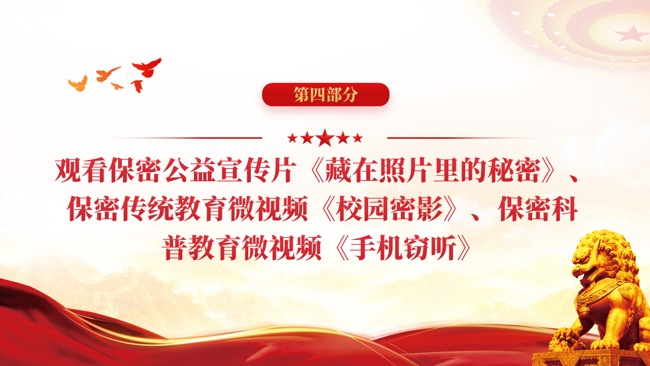 会议还观看了保密公益宣传片《藏在照片里的秘密》、保密传统教育微视频《校园密影》、保密科普教育微视频《手机窃听》。